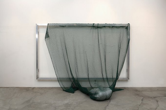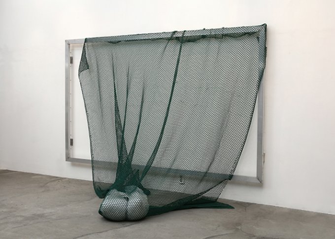 Aluminium structure, green mesh tarp, pillow, brick, rubber band