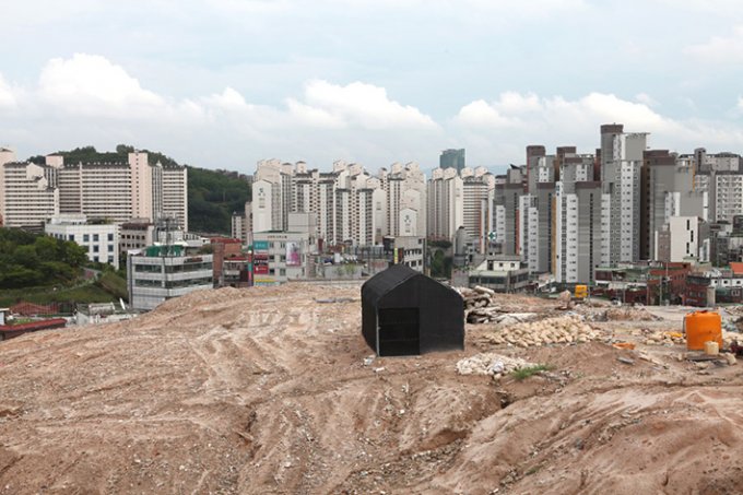 In the summer of 2012, I constructed a new site-specific installation, House Project: Settling into the Vulnerable. This project aims to develop current issues and concerns in relation to a particular aspect of the process of urbanization in South Korea and the notion of space. I work and experiment particularly with the concept of dwelling in relation to the meaning and function of space, particularly the production, transformation and deconstruction of space from both artistic and socio-political perspectives. Specifically, by looking at and expanding some recent cases of urban redevelopment in South Korea, my work focuses on the transformation of the concept of dwelling from the place of permanent residence as a shelter or protection to a means of producing and destroying a (social) space. House or a dwelling space is not considered merely as a closed space that provides a certain kind of inaccessibility from the exterior to the interior, but as a contested zone, in which different forces, relations and elements can coexist and conflict.